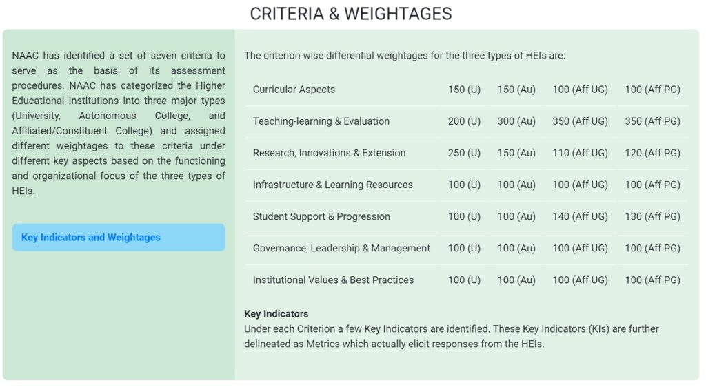 NAAC assess the higher learning institutes based on the following parameters or indicators –