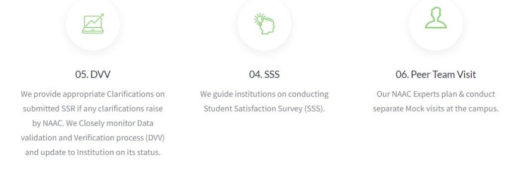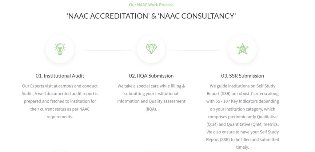 We provide guidance and Consultancy for educational institutions including Universities, Autonomous Colleges, Affiliated Colleges, Teacher Education Institutions and Physical Education Institutions for obtaining the NAAC Accreditation.